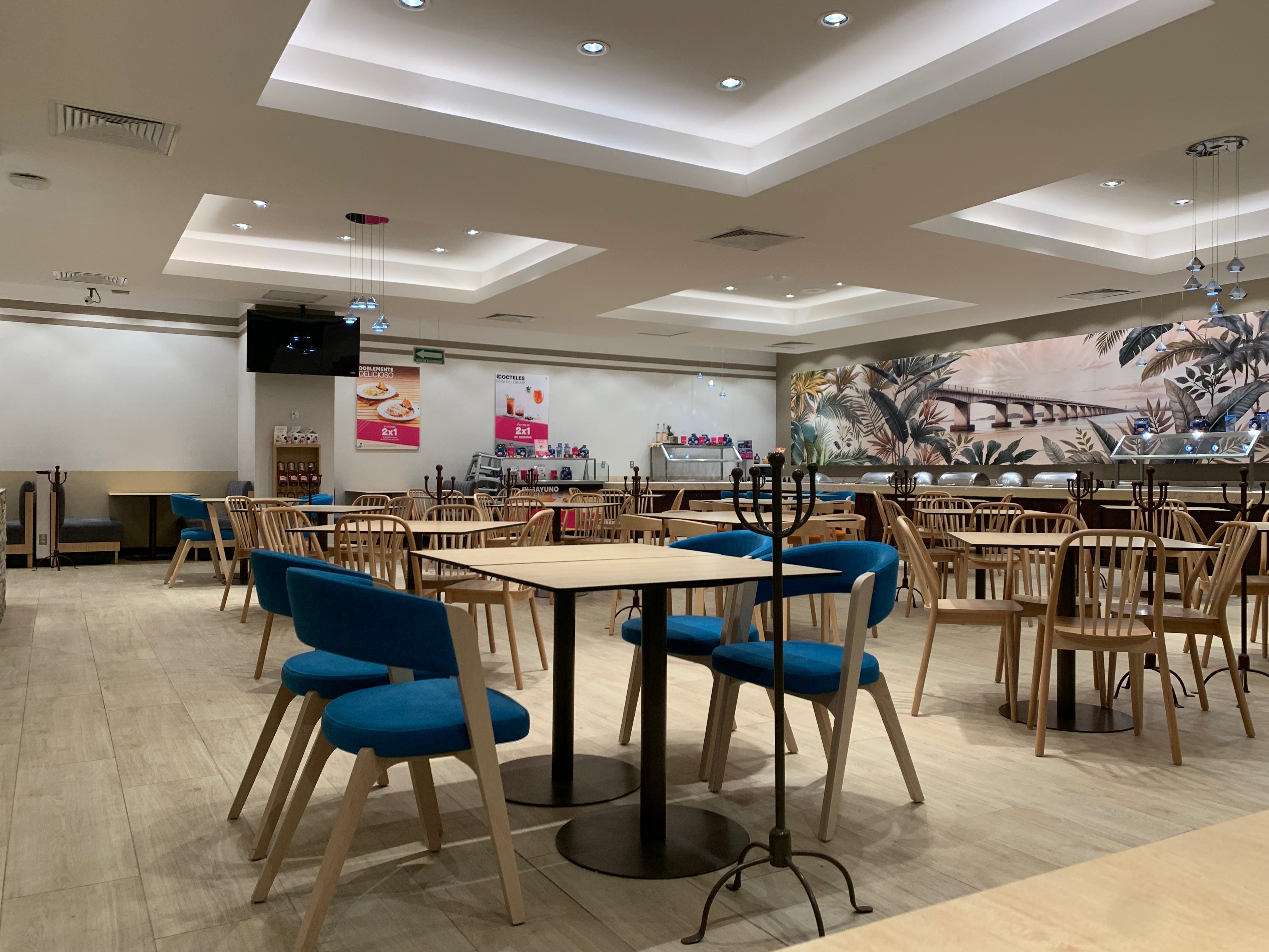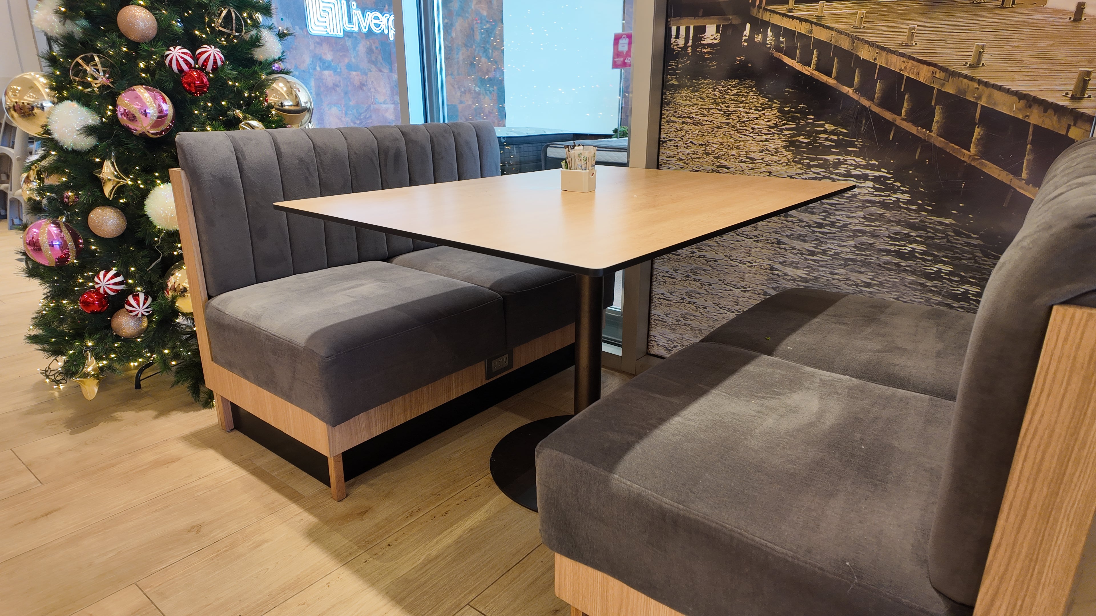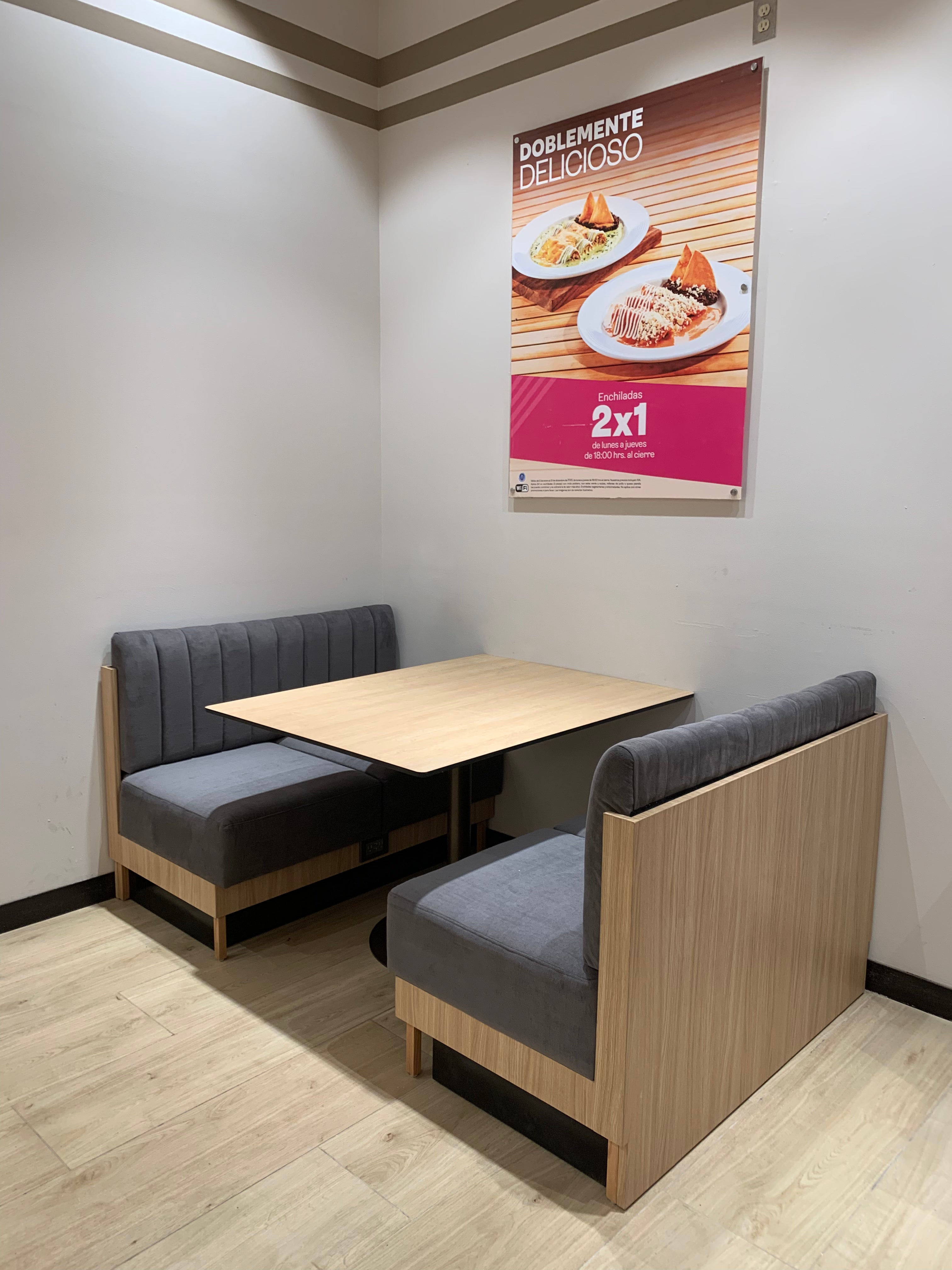 Proyecto de fabricación y suministro de mobiliario para el área de restaurante en Liverpool Ciudad del Carmen. Se desarrollaron booths y mesas elaboradas con sólido fenólico y bases metálicas con pintura electrostática, garantizando alta resistencia, durabilidad y un acabado estético de nivel comercial premium.