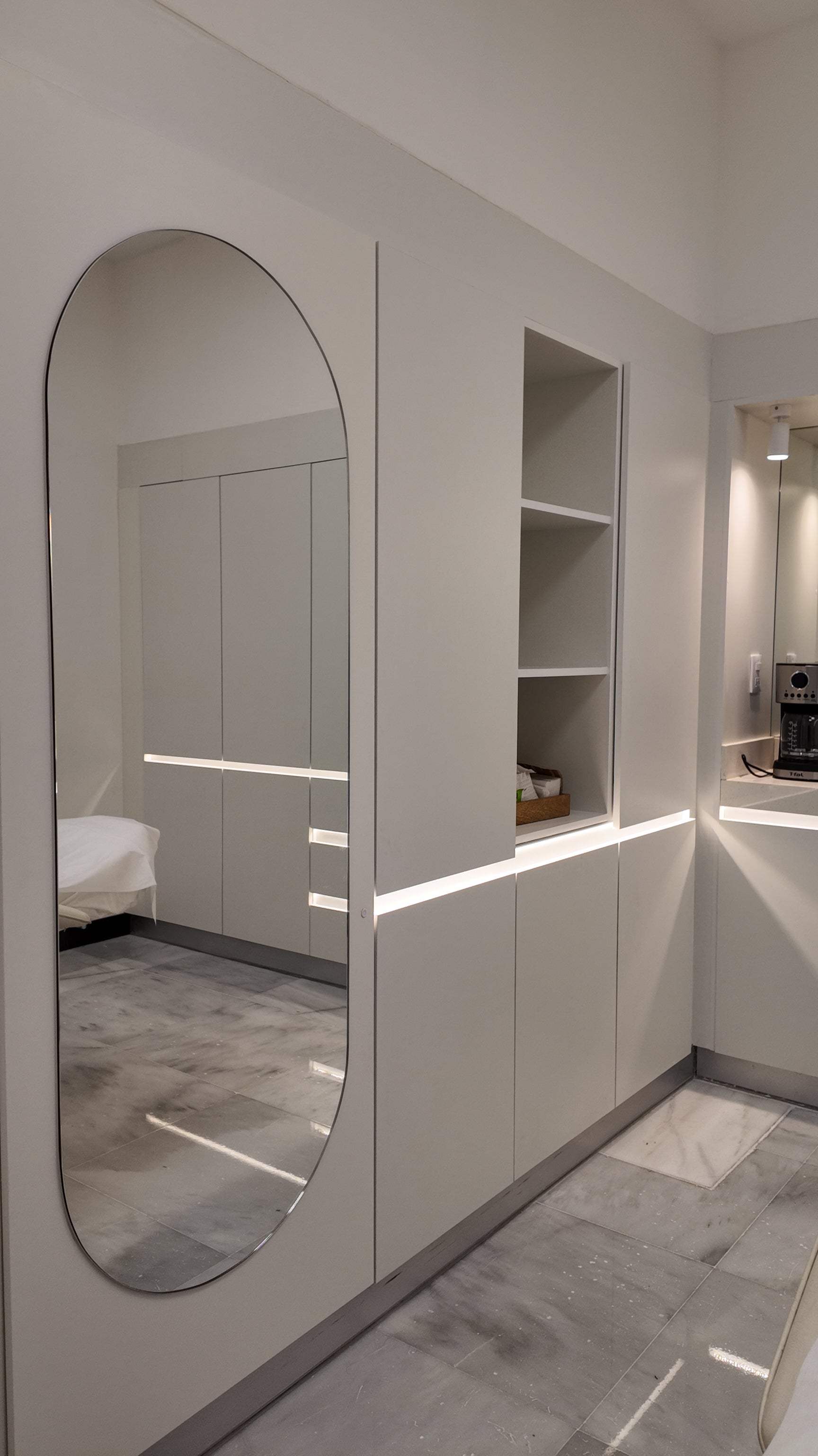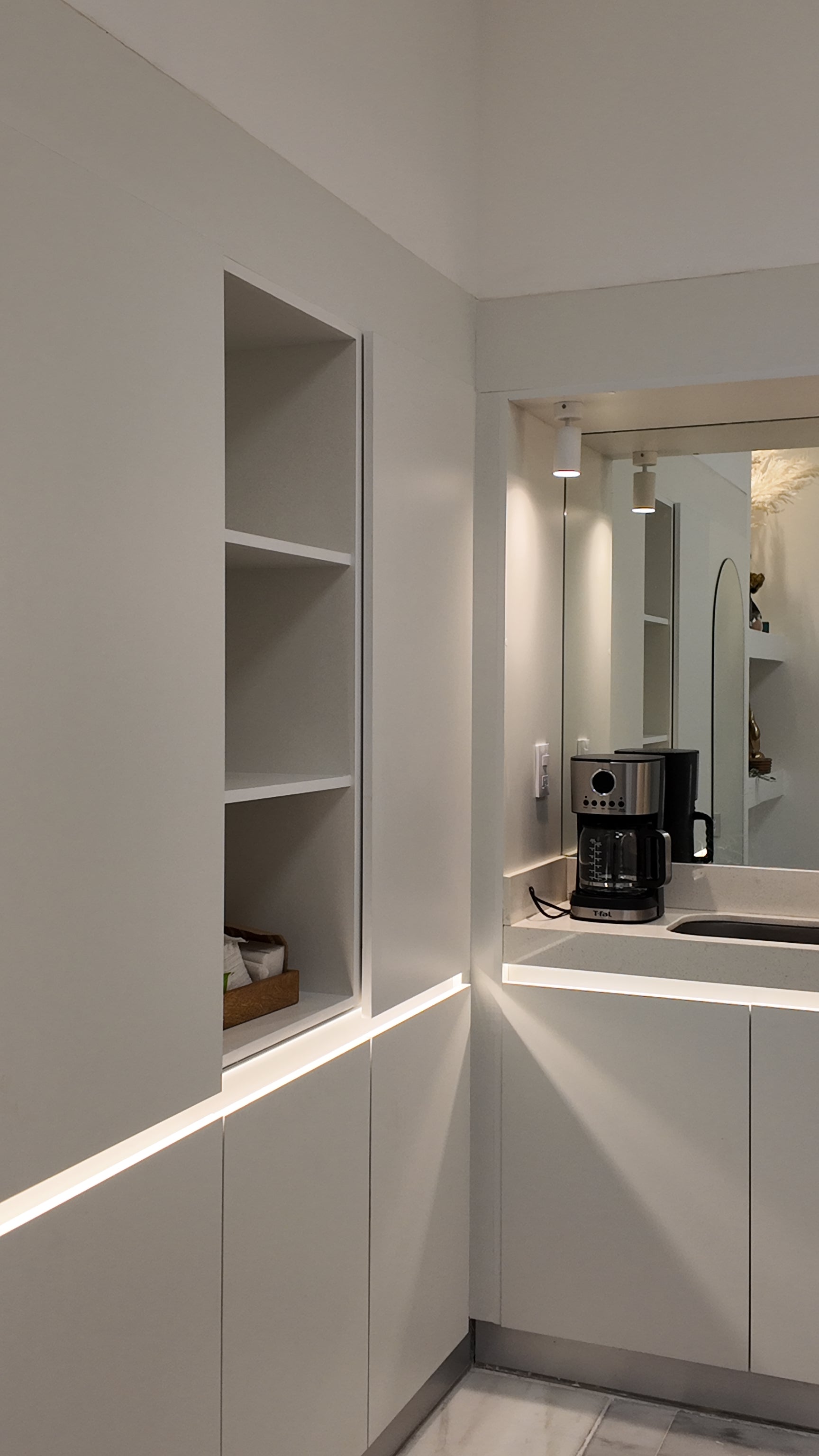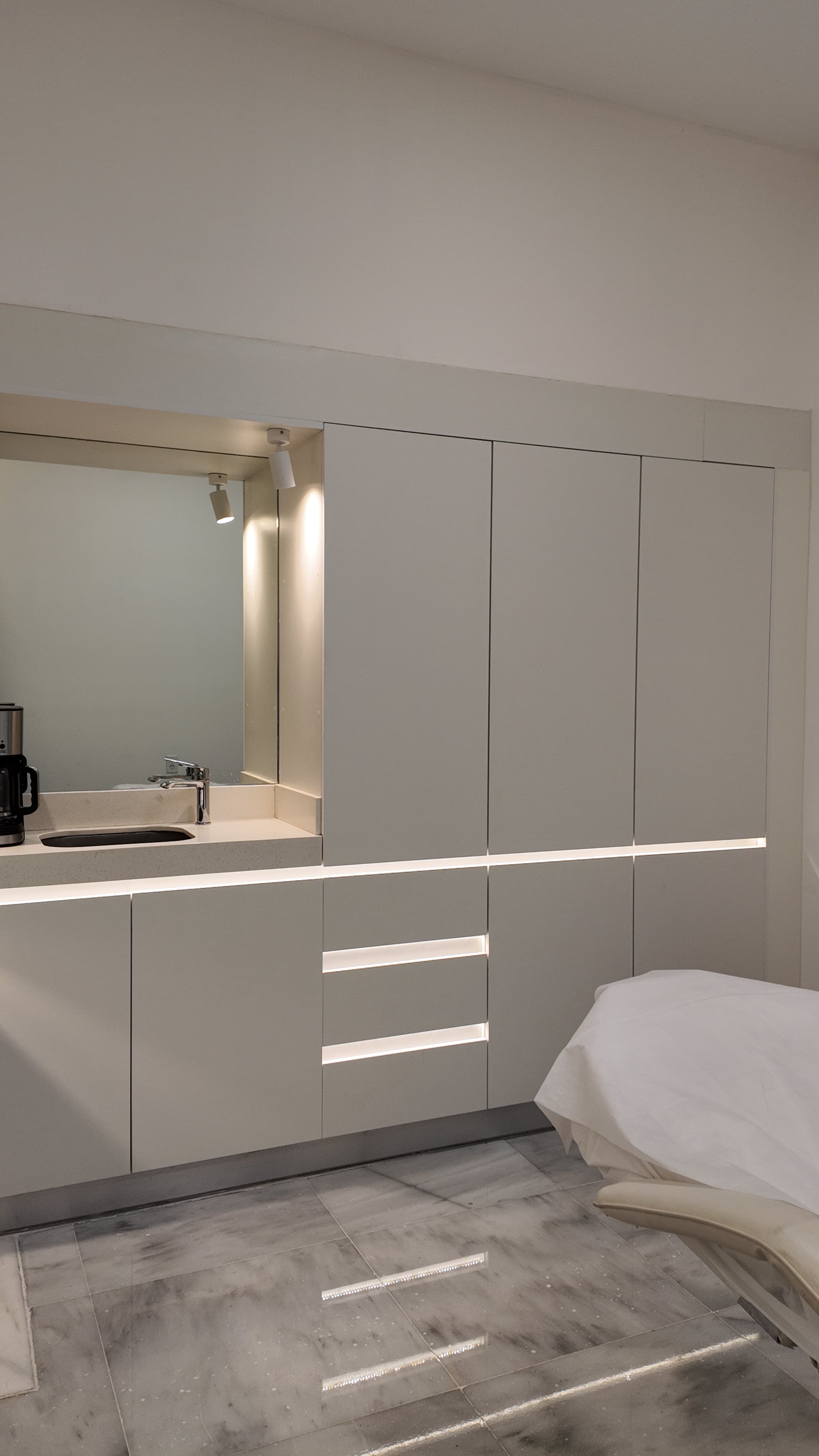 Proyecto de diseño y fabricación de mobiliario a medida para un espacio de bienestar. Se desarrollaron gabinetes integrados, iluminación LED lineal y un área de preparación funcional, utilizando materiales de alta calidad para garantizar durabilidad, limpieza y una estética moderna.
