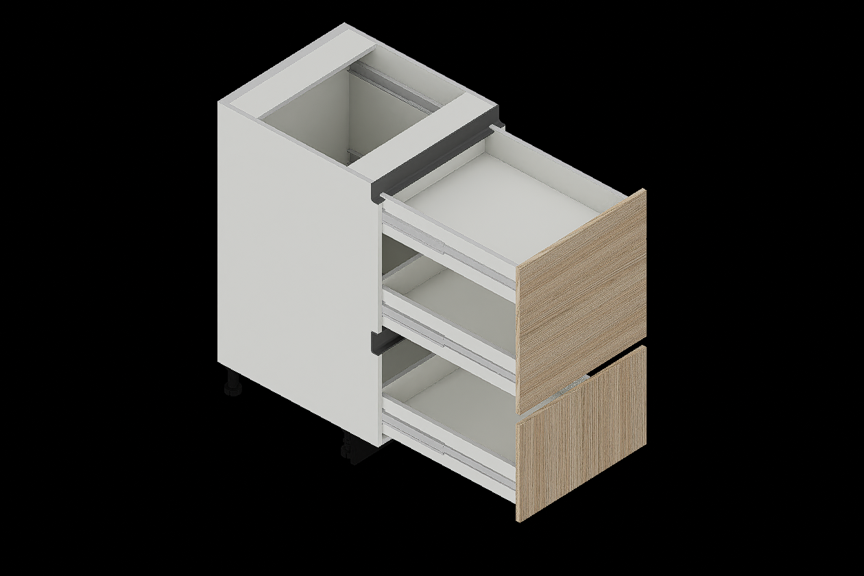 Diseño versátil con dos cajones superiores pequeños y uno profundo inferior, ideal para utensilios, sartenes o accesorios de cocina.